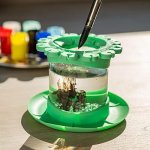 Designed for kid’s classrooms, art studios, and home use, our rinse cups can be used for acrylic, watercolor, and water-based paints. This brush cleaning dish is easy to clean and dishwasher safe. The bottom of each artist paint brush cleaner rinse cup is designed with silicone rubber that removes paint without damaging soft bristles. Designed to keep surfaces safe and not only your brush clean, but the area around you. A wide, stable base collects excess water and paint. This paint brush cleaner tool features a flexible, silicone lid with small brush resting areas inside the cup and outside to hold brushes while they’re rinsing out or not in use. The outside of each lid boasts paint brush holders that keep brushes upright and drying off while protecting surfaces from wet paint.
